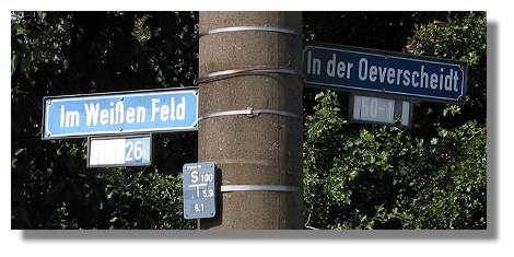 Der Ort Dortmund-Oeverscheidt ist eine kleine Siedlung entlang der alten Verbindungsstraße von Oespel nach Dorstfeld. Noch im preußischen Urkaster von 1827 war der Name Oeverscheid eine Flurbezeichnung für einen einzelnen Hof mit einem großen Waldstück am nordöstlichen Rand der Gemeinde Oespel, weit draußen vor dem Dorf Oespel. Der Name bedeutet "über die Scheide" im Sinne von "jenseits der Grenze". Erst im letzten Jahrhundert bildete sich hier durch Verdichtung der Bebauung ein kleiner Ort heraus. |